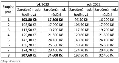 K 1. lednu 2023 došlo ke zvýšení základní sazby minimální mzdy z 16 200 Kč na 17 300 Kč za měsíc. „Toto zvýšení má kromě důsledků pro zaměstnance pracující za minimální mzdu, kteří si finančně polepší, také dopad na řadu důležitých limitů rozhodných pro daňové a jiné odvodové povinnosti,“ říká Gabriela Ivanco, daňová poradkyně společnosti Mazars. Hodinová sazba minimální mzdy se zvyšuje z 96,40 Kč na 103,80 Kč při stanovené týdenní pracovní době 40 hodin. Zaručená mzda se od 1.1.2023 zvyšuje jen u prací zařazených do kategorie 1 a 8, pro ostatní skupiny prací zůstane výše zaručené mzdy v roce 2023 stejná jako v roce 2022.